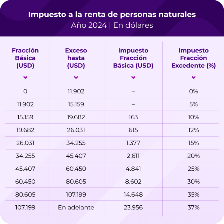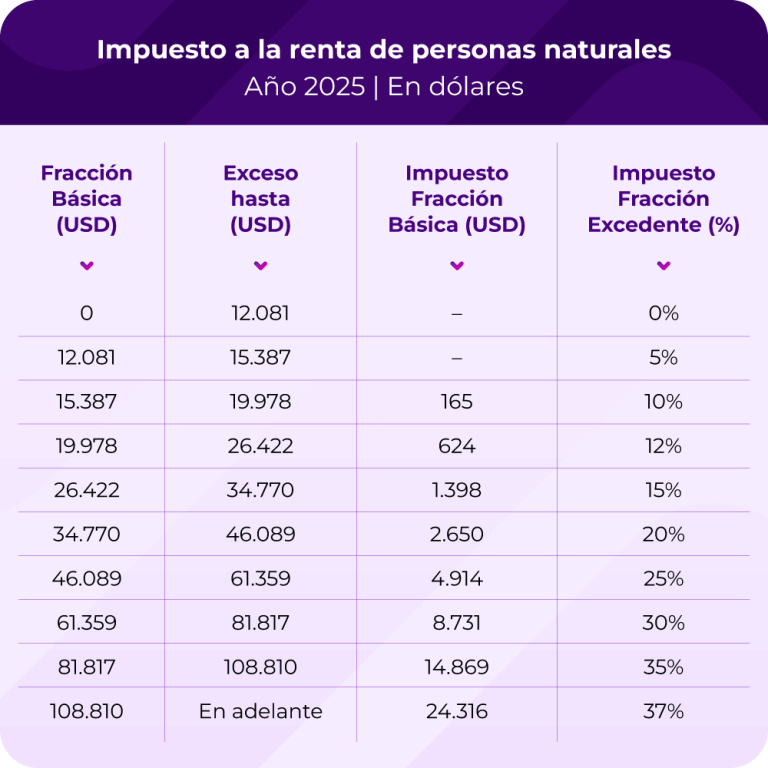 Para 2025, el Servicio de Rentas Internas (SRI) actualizó la tabla de impuesto a la renta, siendo la nueva base imponible de $12.081 ( $1.006,75 dólares mensuales). Tal como lo ves en esta tabla, que es la que usarás en 2026 para declarar los ingresos de 2025: