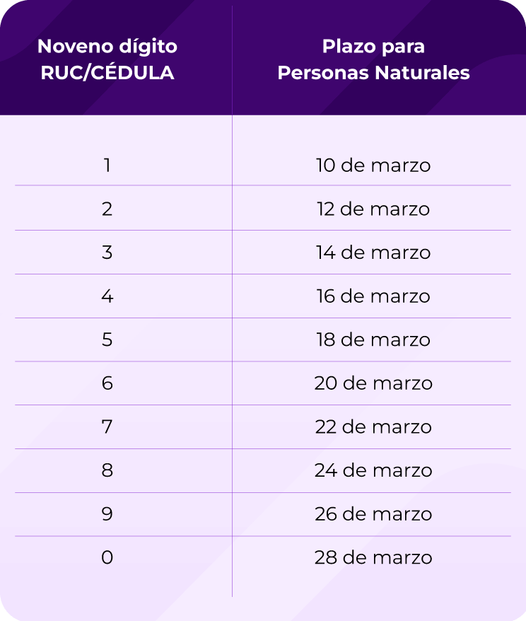 El calendario tributario del Servicio de Rentas Internas (SRI) indica que a partir del 10 de marzo empiezan las declaraciones para personas naturales, de acuerdo al último número de su cédula, y aquí tienes las fechas: