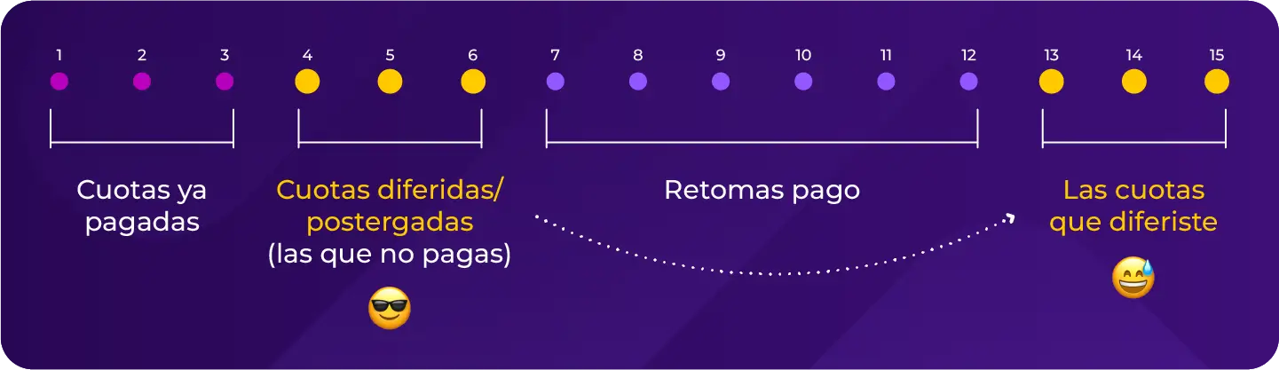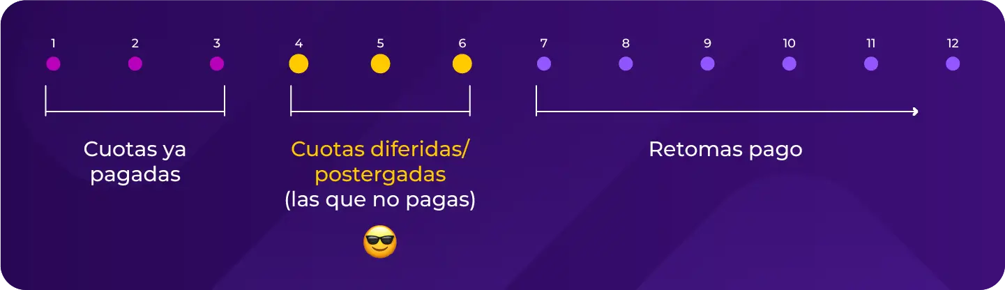 Supongamos que tienes un crédito de consumo a 12 meses y que ya has pagado las tres primeras cuotas tranquilamente y sin novedades. Pero entonces accedes al diferimiento y postergas el pago de las tres cuotas siguientes, algo así: