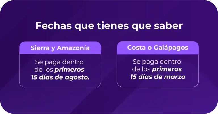 Las fechas para calcular el monto a pagar van a depender de la región en la que vivas. Si vives en la Sierra y Amazonía, se calcula desde el 01 de agosto hasta el 31 de julio del siguiente año y se paga dentro de los primeros 15 días de agosto. Si vives en la Costa o Galápagos, se calcula desde el 01 de marzo hasta 28 de febrero y se paga dentro de los primeros 15 días de marzo. ¿Por qué? Pues porque, como estarás imaginando, depende de la fecha de inicio del año lectivo. ¡Para eso es, ya te lo dijimos!